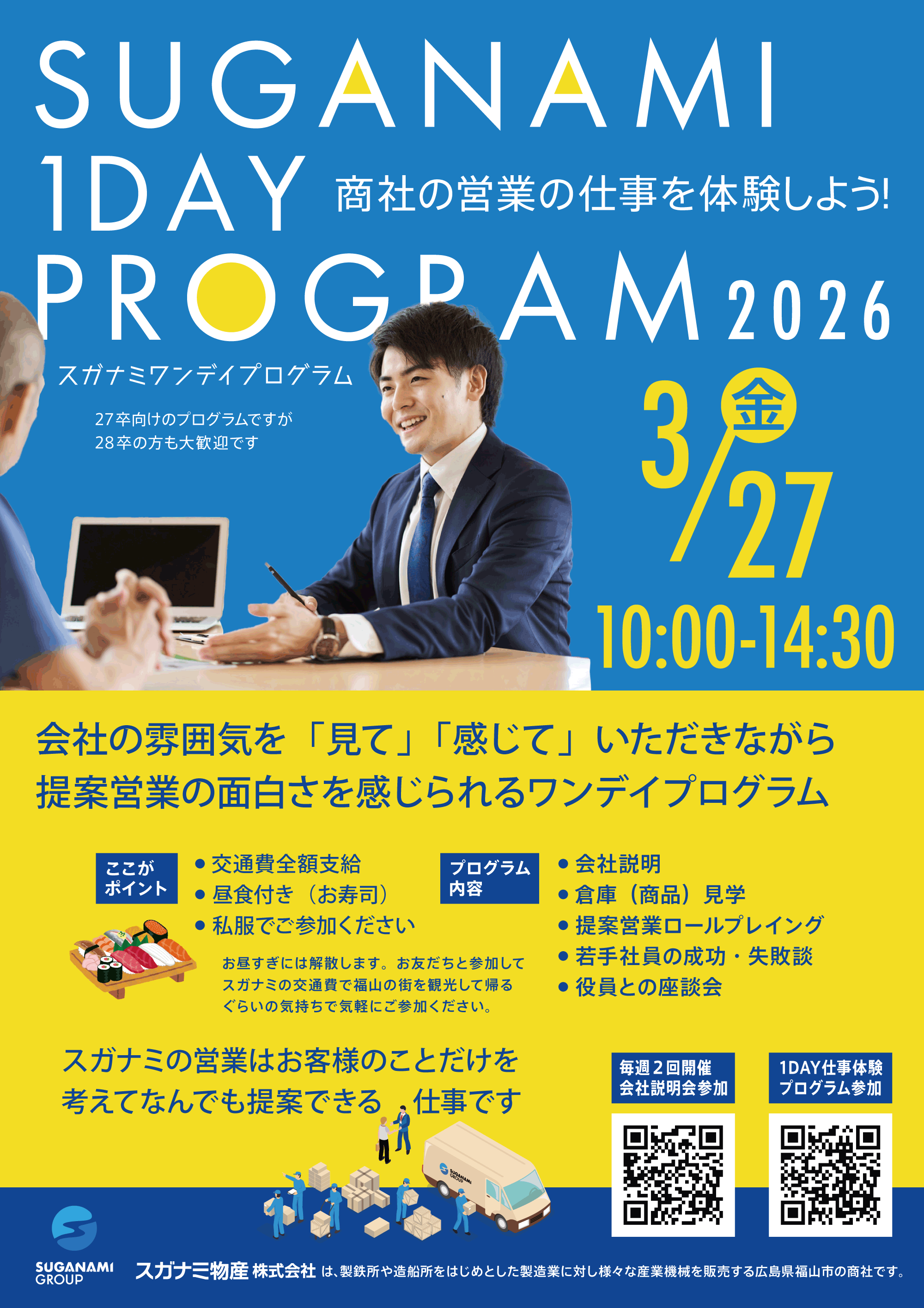 2026.03.10 3月27日(金)1DAYお仕事体験プログラムを開催します 交通費全額支給・昼食支給 昼過ぎには終わるので、当社のオゴリで福山の街に遊びに来てください。 お友達と参加して、帰りに福山観光もおすすめです。